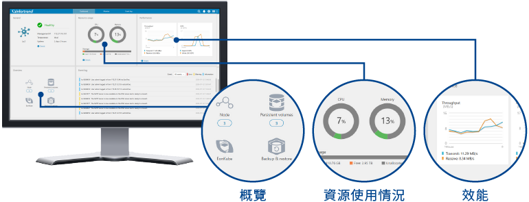 EonOne 提供全面的硬體監控功能,以確保系統平穩運作和最佳效能。此外,還提供簡化的管理界面,方便 IT 人員輕鬆地擴展運算節點或擴展外部儲存節點。